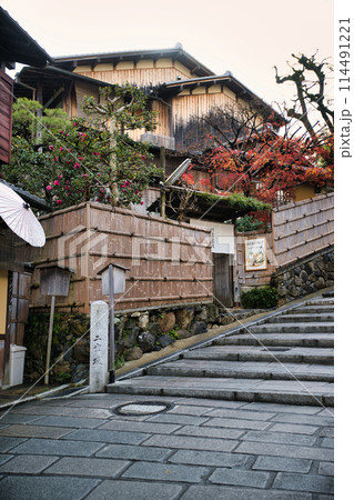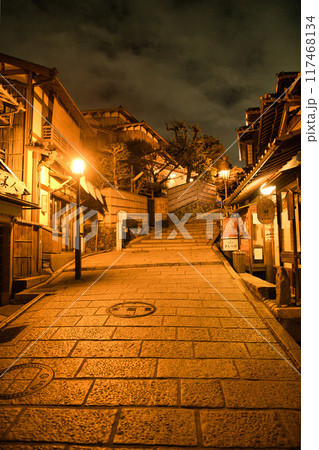 1月の夜明けに京都市東山産寧坂の石段を上がる