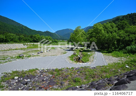 みつまた親水公園 バイカモ群生地付近 清津川 河原の風景