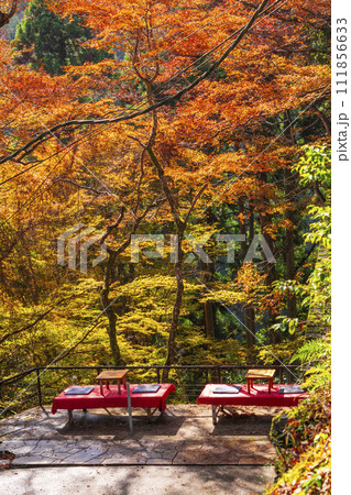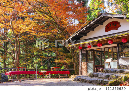 秋の京都 高雄山神護寺参道 紅葉に包まれた高雄茶屋