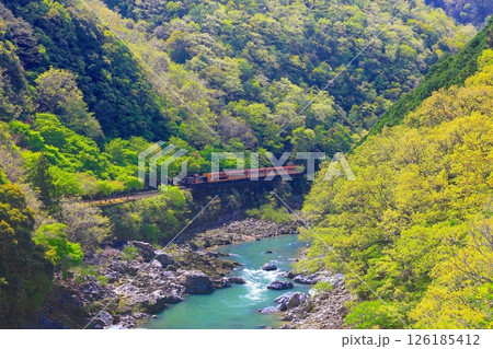 新緑の保津峡をゆく嵯峨野トロッコ列車