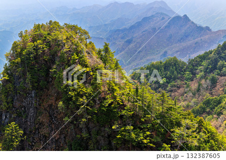 早春の両神山山頂からアカヤシオツツジ咲く赤岩尾根の岩峰