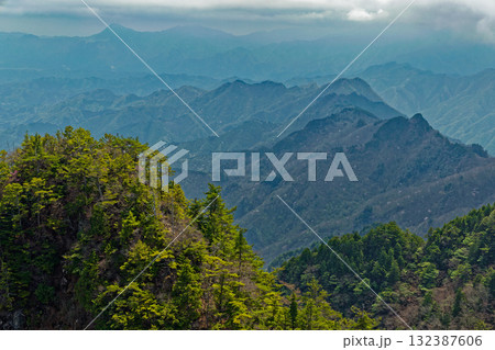 両神山・八丁尾根から見る霧に煙る新緑の山並み