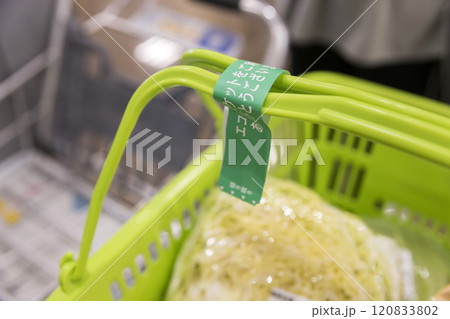 スーパーレジで購入済みテープを巻いた買い物カゴ レジカゴテープ