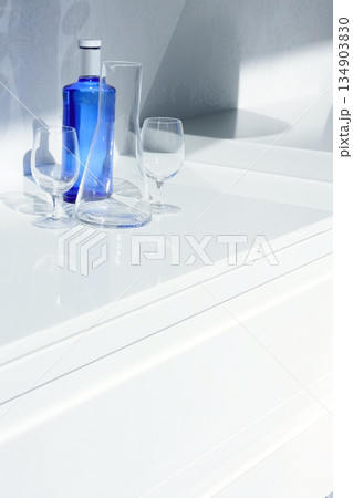 Elegant glass bottle filled with bright blue liquid on a soft white background