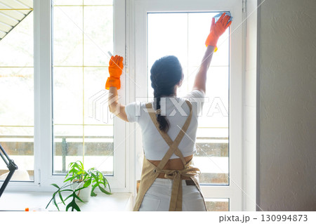 Woman in rubber gloves and apron manually washes window balcony of house with rag cleaner and mop inside interior. Restoring order and cleanliness in spring, cleaning servise