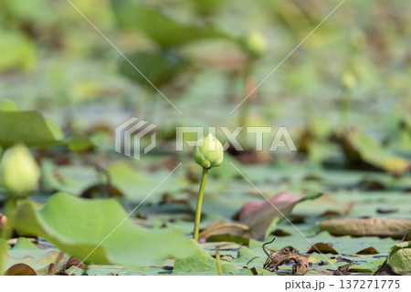 Lotus bud standing above calm pond with green leaves soft natural light and blurred background representing peaceful aquatic plant life in tropical wetland environment