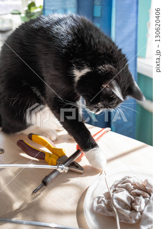 Black and white cat curiously exploring tools on a wooden table with sunlight streaming in