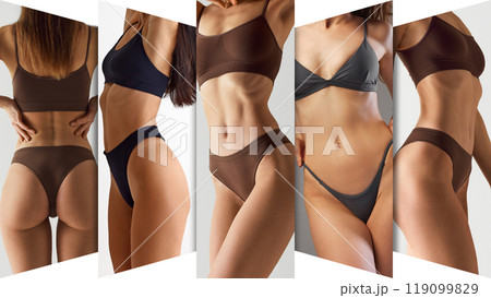 Collage. Toned female bodies in natural postures. Earthy tones of their underwear combined with artistic angles highlight body diversity and confidence.