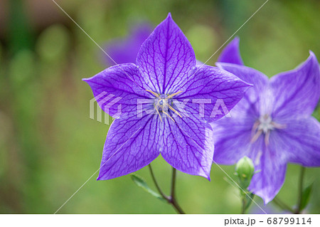 開花寸前、紫色のキキョウの蕾(マクロレンズ使用・屋外自然光・接写写真)