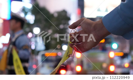 スクランブル交差点を誘導棒で交通整理をする警視庁の警官