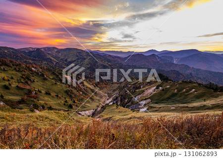 夏 志賀高原渋峠から望む朝焼けの白根山山麓