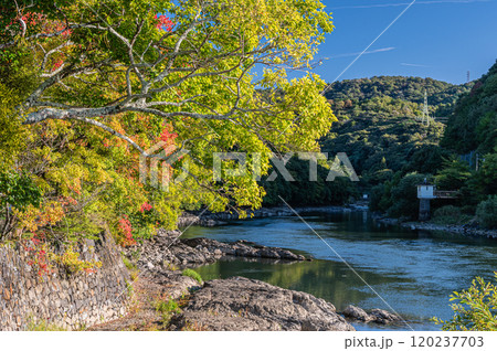 宇治川沿いの黄色く色づいた木々 京都府宇治市