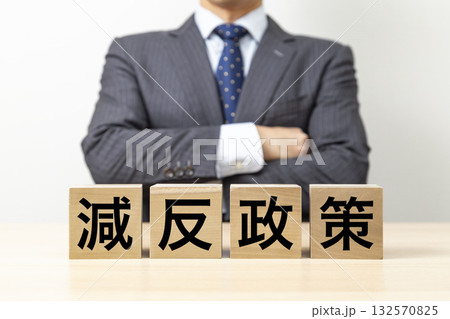 「減反政策」と書かれたブロックと腕組みをするビジネスマン
