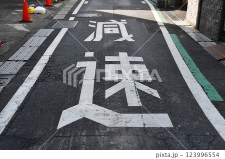 舗装後の道路標示と補助線 細い道の減速路面標示 モノクロ