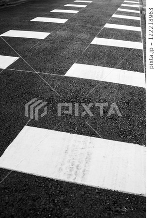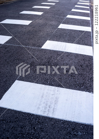 舗装後の道路標示と補助線 細い道の減速路面標示 モノクロ