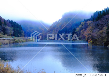 只見線早戸駅付近から望む秋の「霧幻峡の渡し」(福島県三島町、11月上旬)