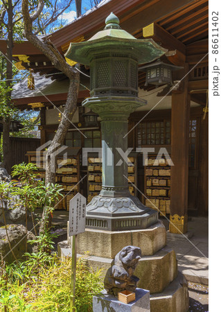 [東京・愛宕] 愛宕神社の中庭に置いてある銅灯篭と招き猫を形した招き石。