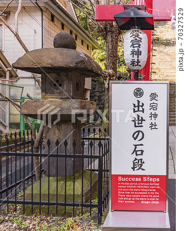 [東京・愛宕] 東京の愛宕神社の石灯篭と紙灯篭と出世の石段の説明看板