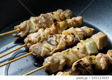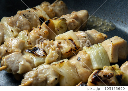 焼鳥(ねぎま串)をフライパンで温め直す調理シーン。