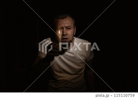 Frightened man with a candle during blackout. Man looking at the camera with a candle in the dark