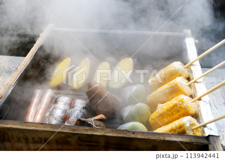 霧島温泉の蒸気蒸しされる野菜とお団子