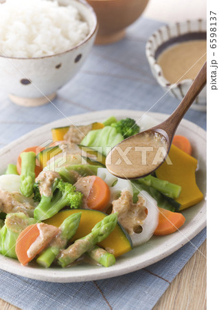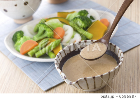 温野菜サラダにごまドレッシングをかける