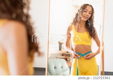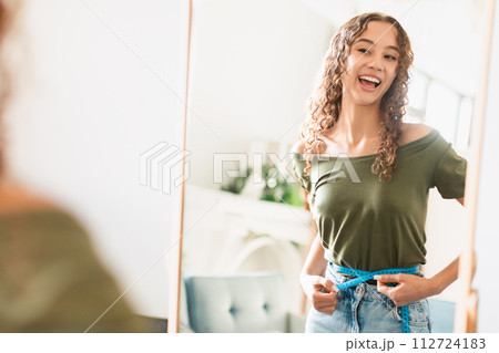 teen lady measuring waist proud of weight loss journey indoor