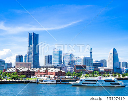 日本の横浜都市景観 水上バスや新港ふ頭客船ターミナル・横浜ハンマーヘッドなどを望む=13日