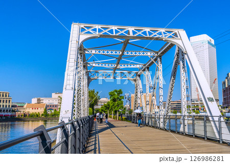 日本の横浜都市景観 夏のような日差し…汽車道の港一号橋梁(手前)や港二号橋梁(奥)などを望む=6月5