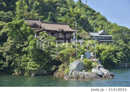琵琶湖の湖上から竹生島神社の宮崎鳥居を望む