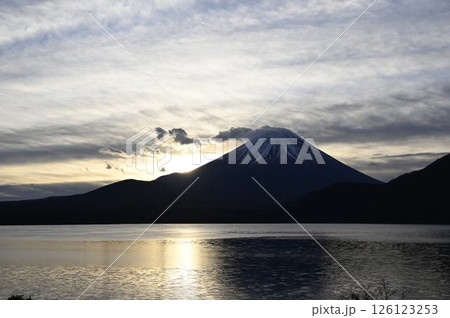 山梨県 浩庵キャンプ場から見る本栖湖越しの富士山 5月