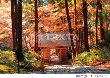 【滋賀県】晴天の百済寺の仁王門と紅葉