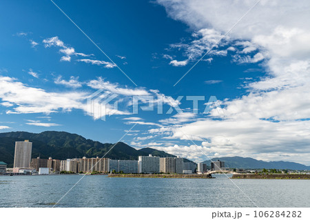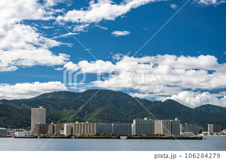 穏やかな青い湖と奥に広がる緑の森と住宅地が映える初夏の風景写真