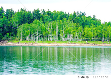 初夏の北海道 新緑の朱鞠内湖 湖畔の木