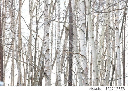 初冬の北海道 ダム湖湖畔の白樺 湖畔林