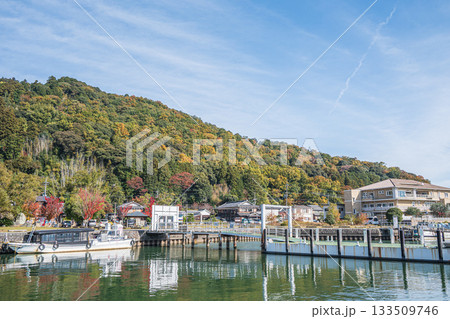 滋賀県長浜市西浅井町 菅浦湖岸集落の民家と紅葉の山並み