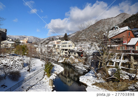 塩原温泉 箒川沿いの塩原温泉街雪景色と青空