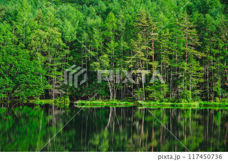 夏の鮮やかな緑の御射鹿池