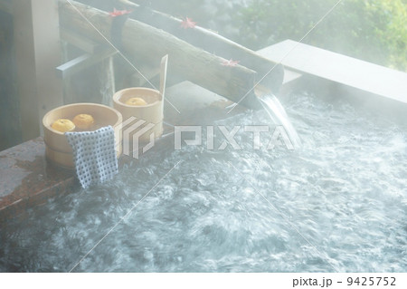 秋冬の素材・温泉の朝、湯煙りに霞む湯桶に柚子の実アップ・横位置