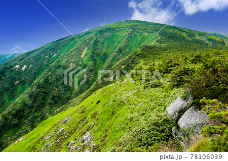 越後 平ヶ岳山頂への道 池ノ岳木道越しの平ヶ岳