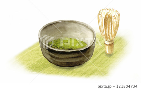 湯のみ茶碗に入った抹茶と茶せんの水墨画風イラスト