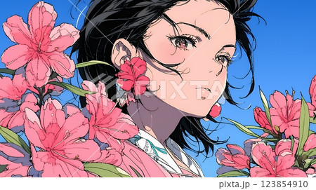 満開のツツジの花と若い女性