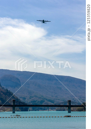 八ッ場あがつま湖の上を飛ぶ飛行機 群馬県八ッ場ダム