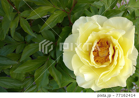 左に緑の葉、右に黄色い牡丹の花な横型写真