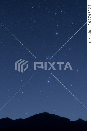 北杜市長坂町、南アルプスの山並みとオリオン座と冬の大三角