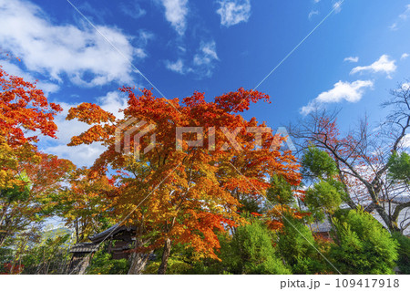 秋の京都・源光庵 秋晴れの空と本堂と紅葉