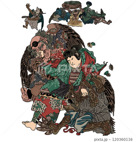 勝川春章-源義仲四天王トともに木曾の奥山に天狗を退治す・駒若丸源義仲根の井