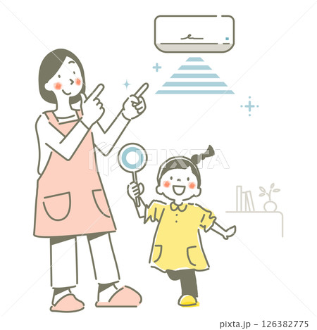 エアコンで快適に過ごすお母さんと女の子 シンプルでかわいい線画イラスト