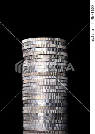 Column of zigzag stacked silver coins, against black background. Stacked circulated silver bullion coins, with reeded edges, of one troy ounce of 99.9 percent pure silver each. 999 fine silver coins.