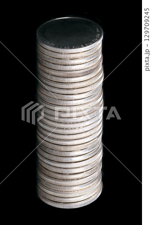 Stack of silver coins with reeded edges. Twenty-eight circulated silver bullion coins, each of one troy ounce of 99.9 percent pure silver, stacked on top of each other, against black background. Photo